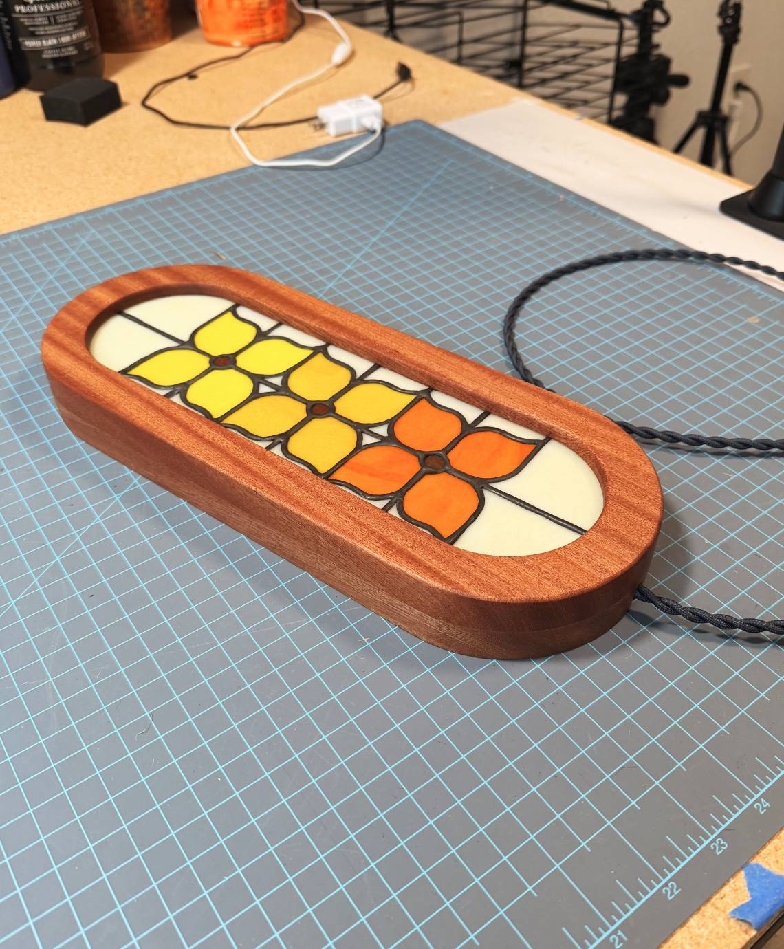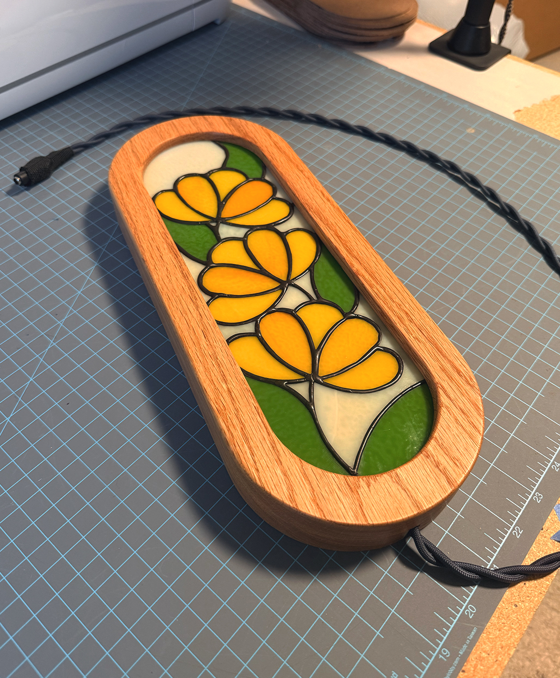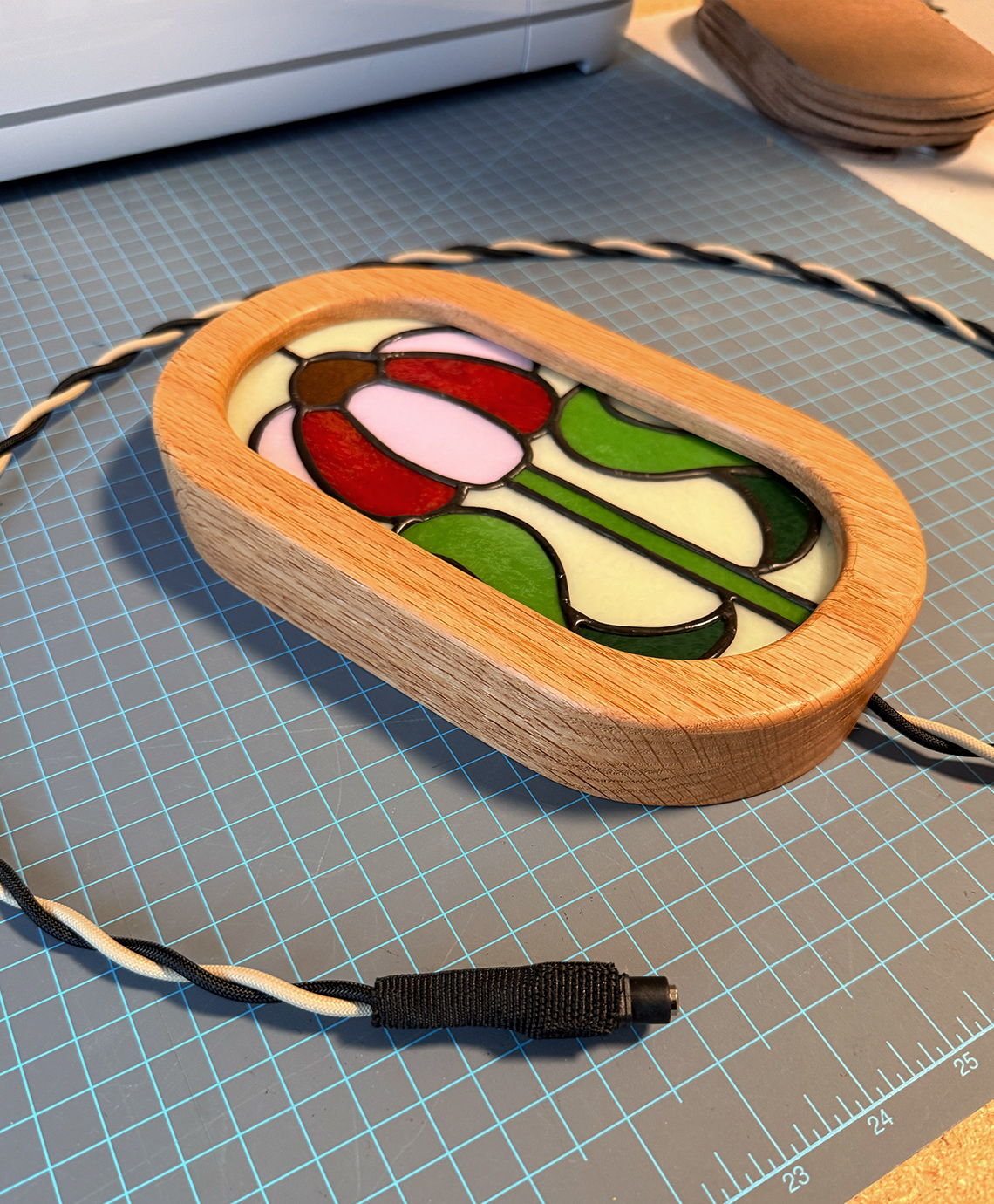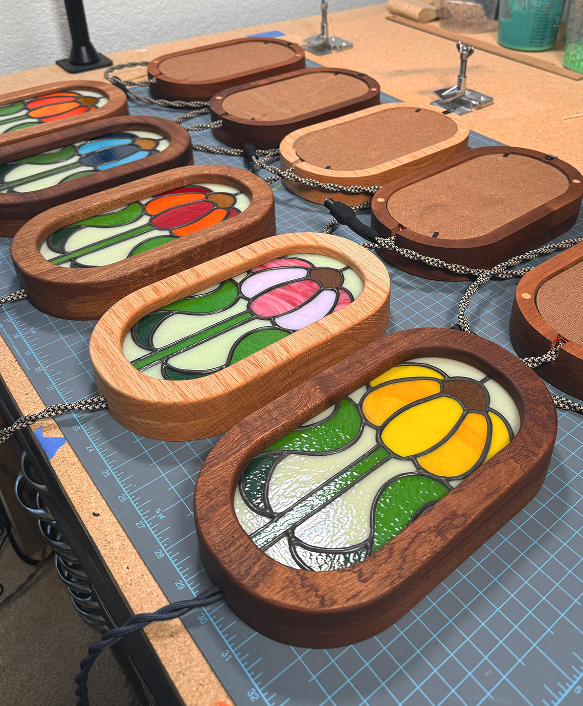 Kate and Spike's exploration of stained glass and light. From concept to glow, every light box is made entirely in-house. We design each pattern, cut and assemble the stained glass by hand, CNC-mill the frame, and finish every piece ourselves. Available for commissioned work as well.