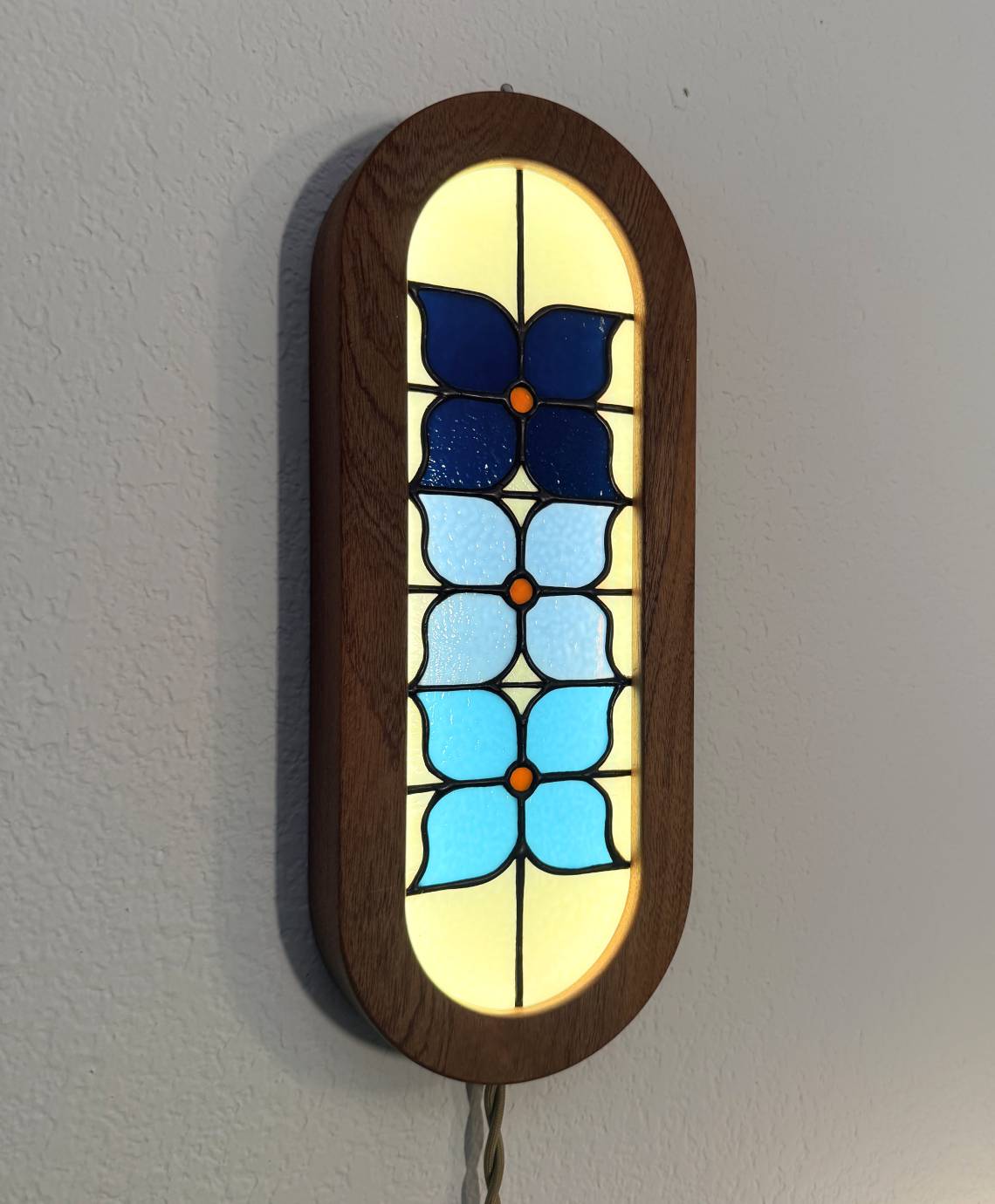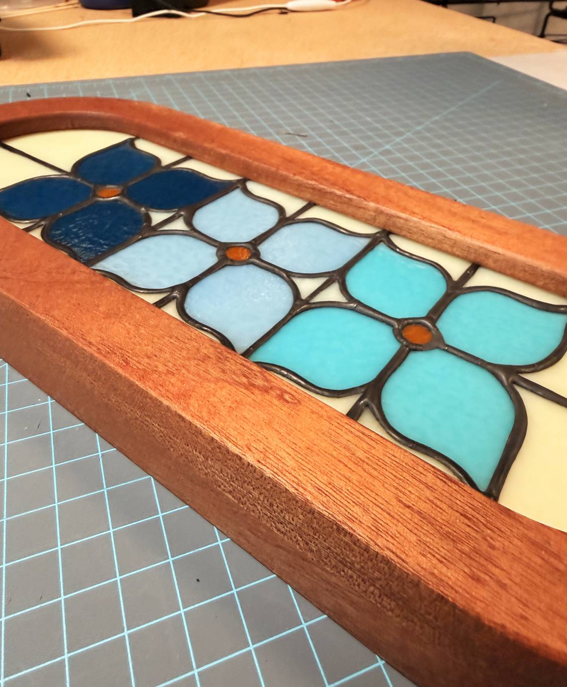 Custom made flower stained glass panel set in a mahogany frame light box.