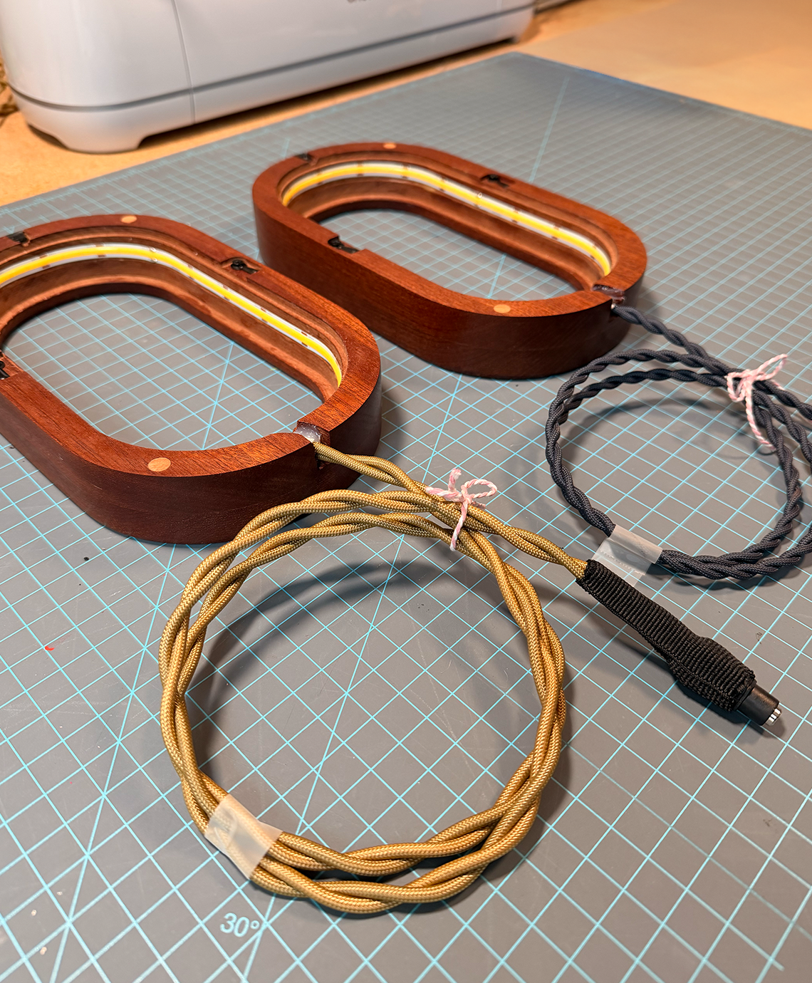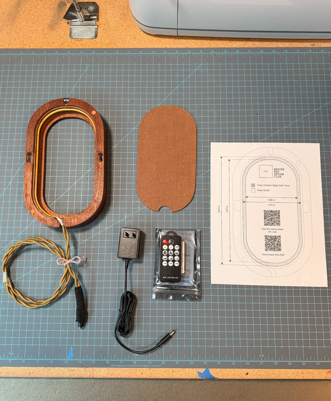 We designed this frame because we couldn’t find one. Each frame is made from mahogany and arrives fully assembled with integrated lighting, dimming controls, and mounting hardware already installed. It’s a complete system so you can focus entirely on the glass. Inside, a built-in ledge supports your piece. Every frame includes a printed sizing guide (also available for download) that shows the exact working area, safe margins, and shelf placement so your glass fits cleanly the first time. To install your piece, place it on the ledge and secure it from the back with a bead of silicone. Once set, close the removable backing plate and mount it on the wall.