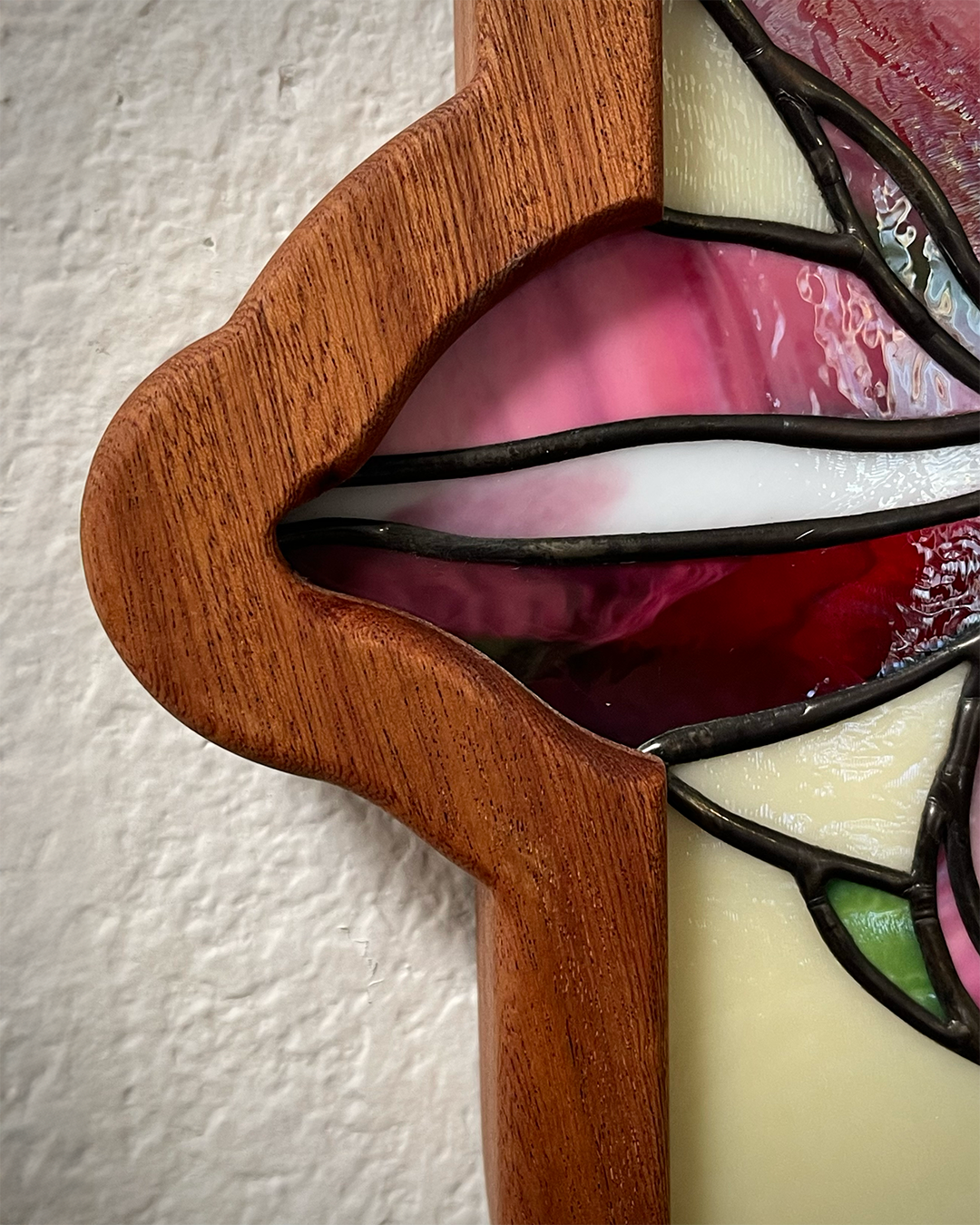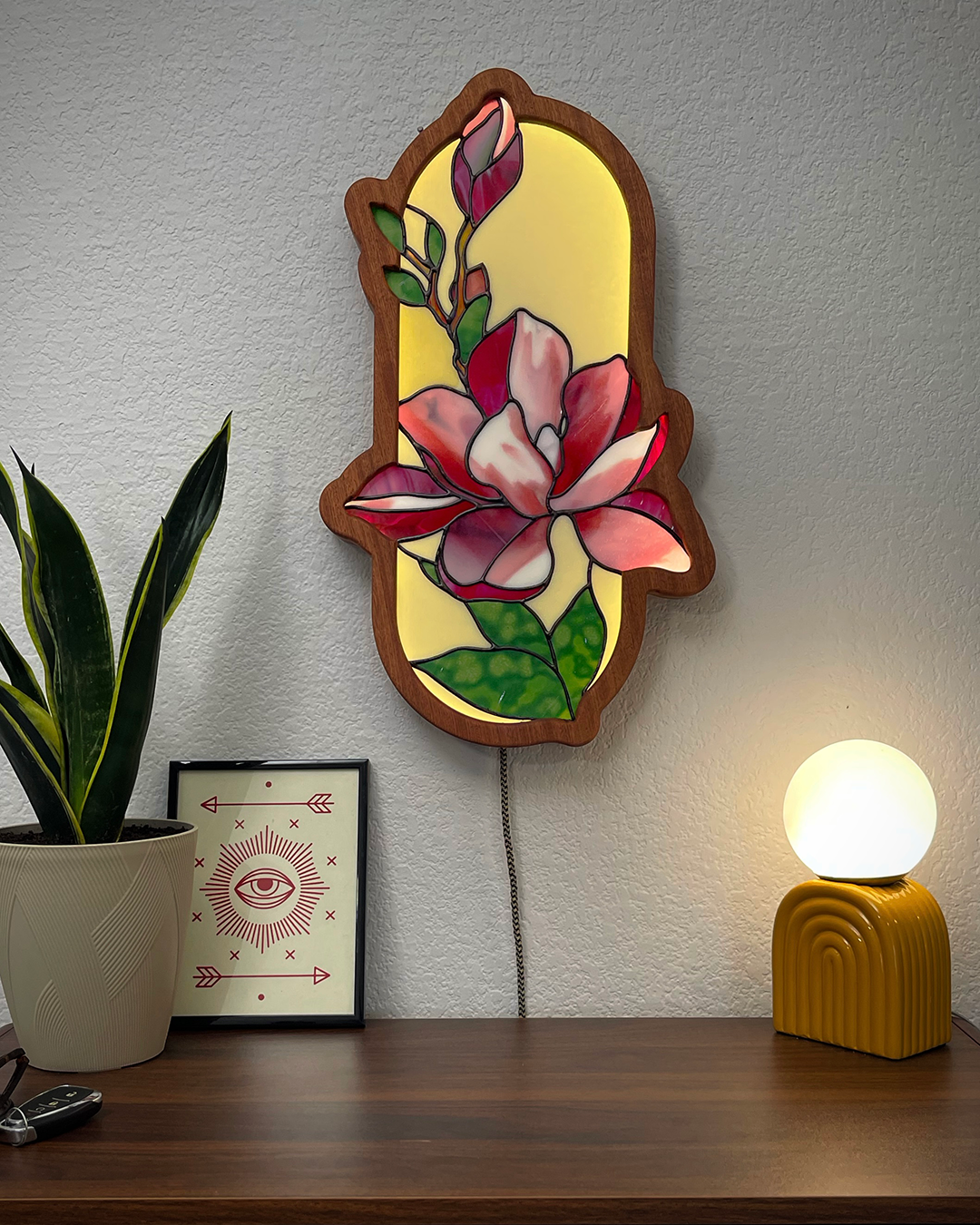 This light box features a custom stained glass panel set in a mahogany frame. Included dimmer switch allows you to adjust the glow. This particular piece uses carefully chosen parts of a glass sheet to achieve the unique look to the flower petal. Please allow extra time to source the perfect glass. Dimensions are 18" x 7" x 2"