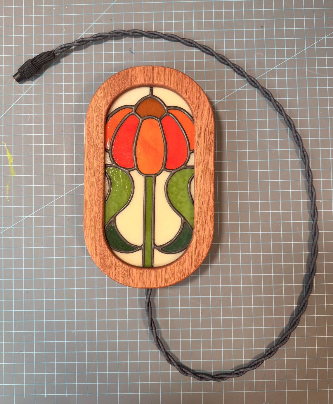 Custom made flower stained glass panel set in a mahogany frame light box.