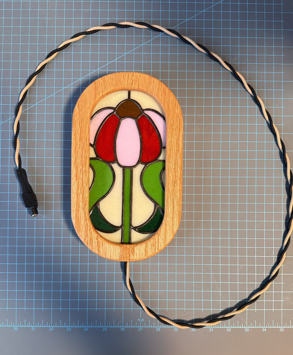 Handmade in Austin, Texas by artists Spike and Kate, this stained glass light box features a custom stained glass panel set in a red oak frame. Dimensions are 6" x 10" x 2"