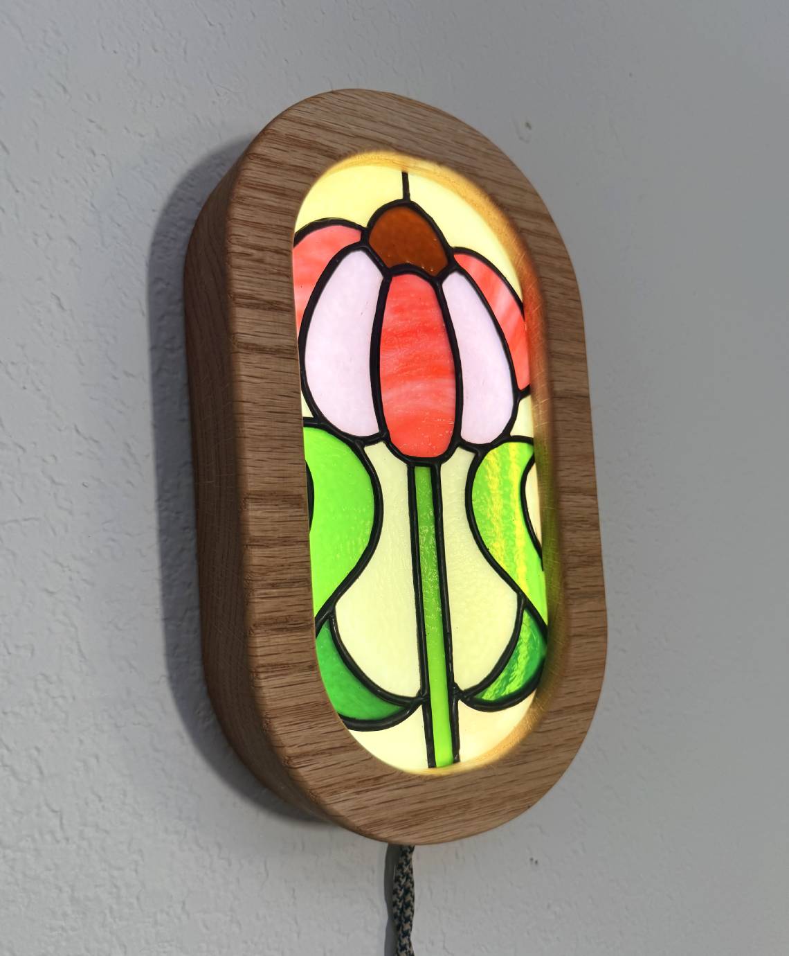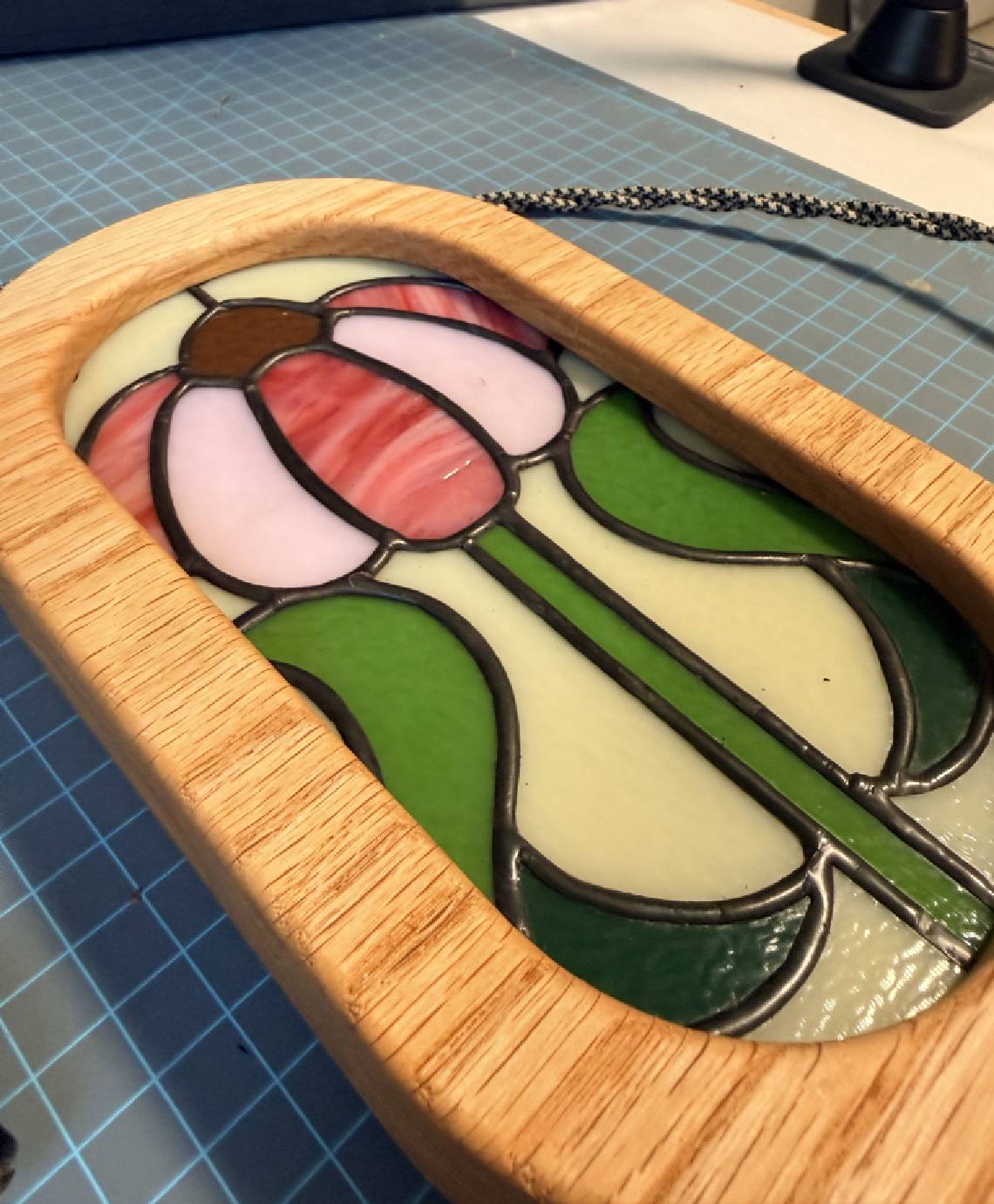 Custom made flower stained glass panel set in a mahogany frame light box.
